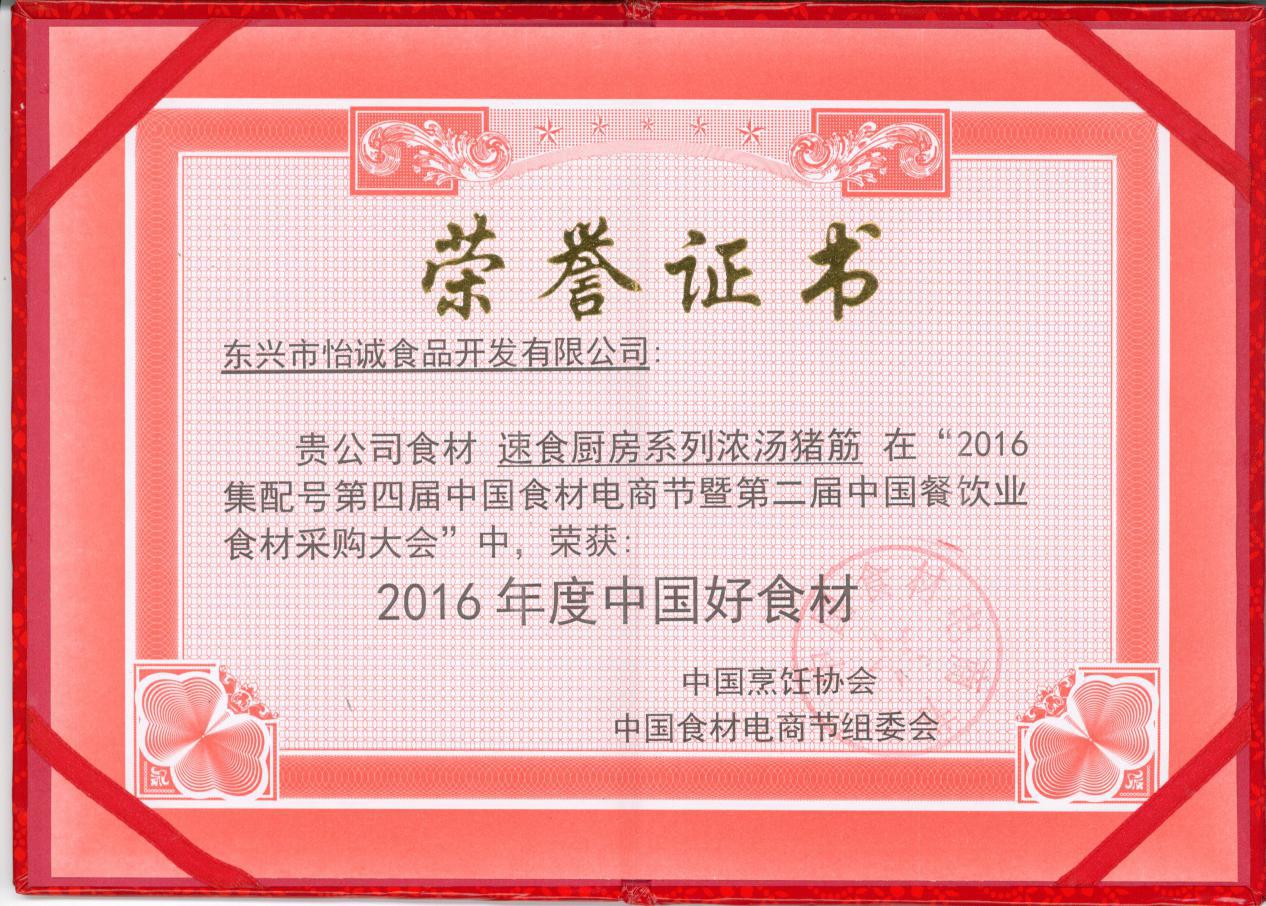經(jīng)過長達(dá)30天激烈的海選,線上平臺(tái)總投票數(shù)超過24萬票,“濃湯白汁燉豬筋”菜肴在82家參選商中脫穎而出,最終獲得“2016年度第四屆電商食材節(jié)中國好食材獎(jiǎng)”。并且創(chuàng)制本菜式的公司星級(jí)廚師團(tuán)隊(duì)亦以其精湛廚藝獲得大會(huì)頒發(fā)“中國好菜式”獎(jiǎng)項(xiàng)。