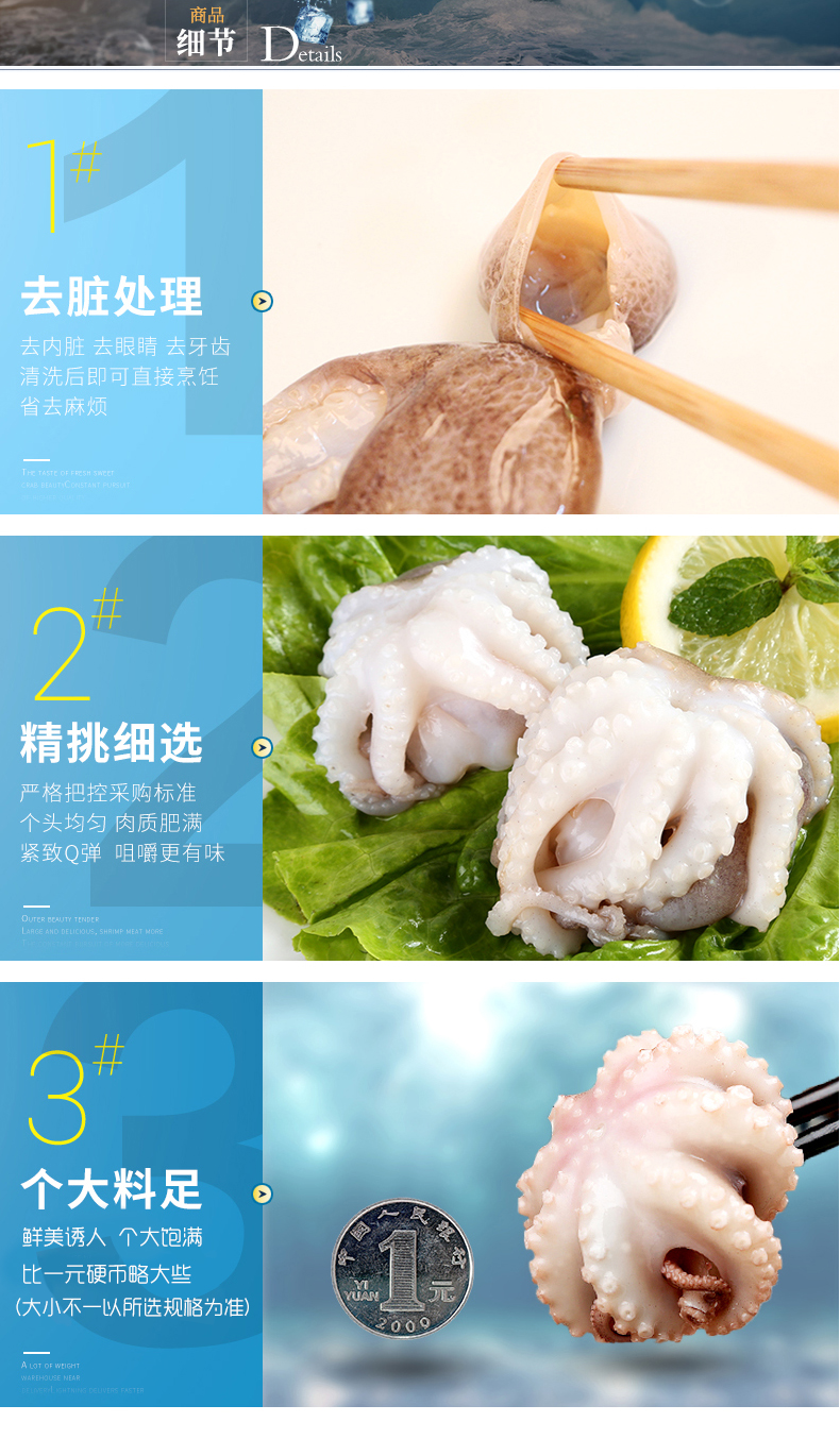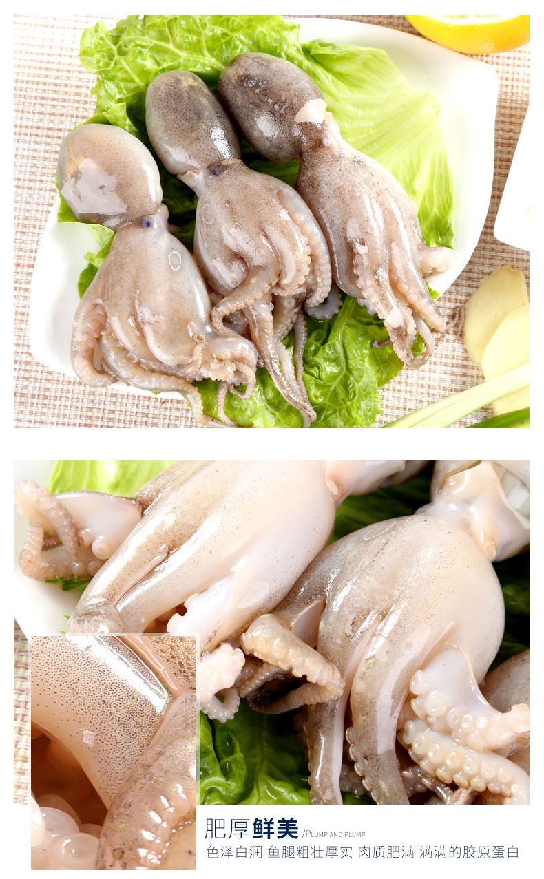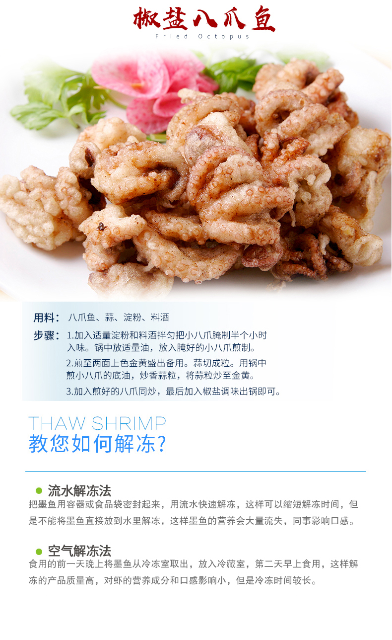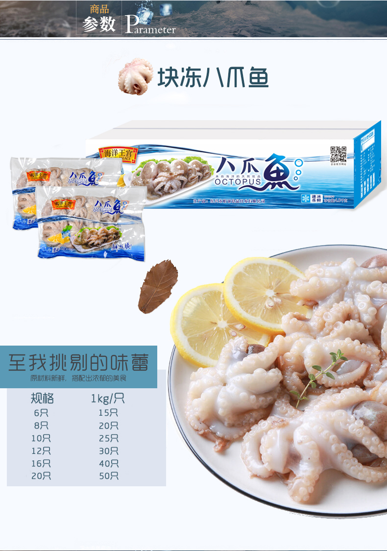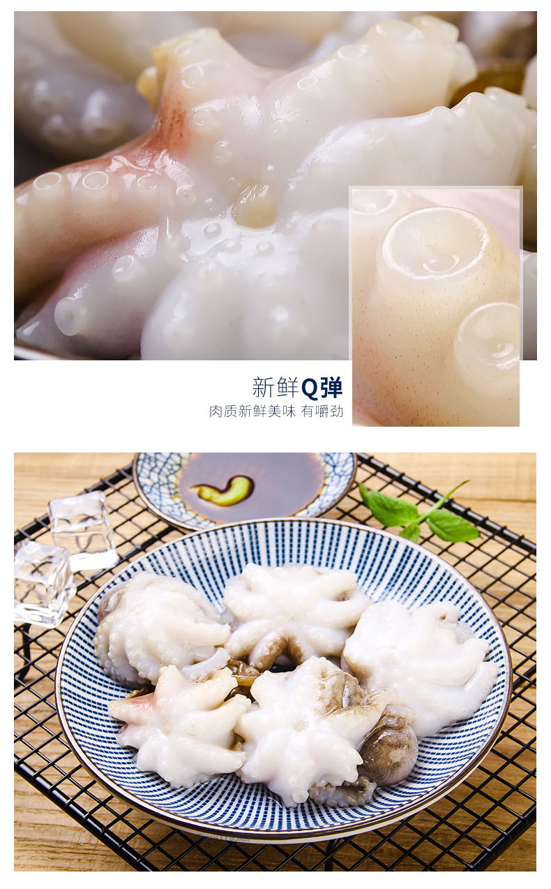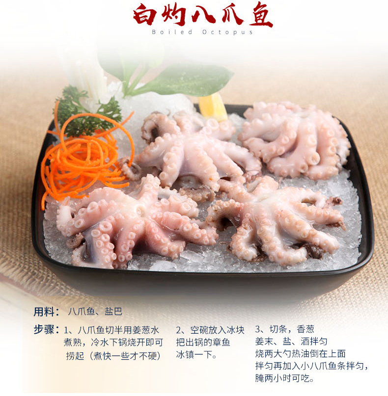 八爪魚(yú)又名章魚(yú),是一種棲身于深海的軟體動(dòng)物,因擁有八條細(xì)長(zhǎng)的觸腕而得名,其肉質(zhì)爽厚脆嫩,清甜多汁,致密而富有彈性,并且含有天然的?;撬?,營(yíng)養(yǎng)價(jià)值非常高,因此八爪魚(yú)不單單是美味的海鮮食材,而且也是民間食療進(jìn)補(bǔ)的佳品。本產(chǎn)品取材于深海捕撈的鮮活八爪魚(yú),以完善的冷凍保鮮技術(shù)和嶄新的高端流水生產(chǎn)線進(jìn)行速凍加工,使八爪魚(yú)體內(nèi)蘊(yùn)含的營(yíng)養(yǎng)成分充分保留,并維持八爪魚(yú)鮮美爽嫩的天然口感。加工后的八爪魚(yú)產(chǎn)品晶瑩潔白,脆彈有勁,飽滿細(xì)滑,肉汁源源不斷滲出,鮮香撲鼻而來(lái)。產(chǎn)品可用于烹制各類菜肴,烹調(diào)方式包括清蒸、紅燒、干鍋、燜燉、熬制滋補(bǔ)湯品、滾涮火鍋等,用途豐富多樣。