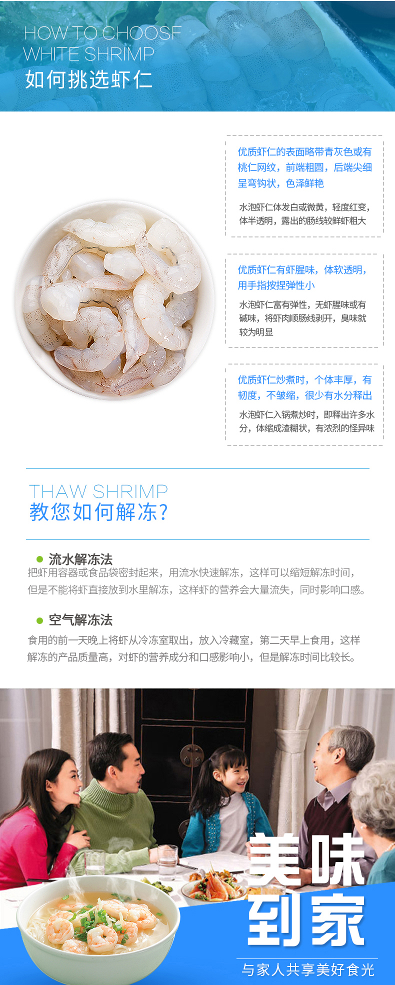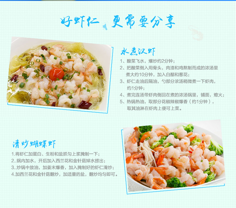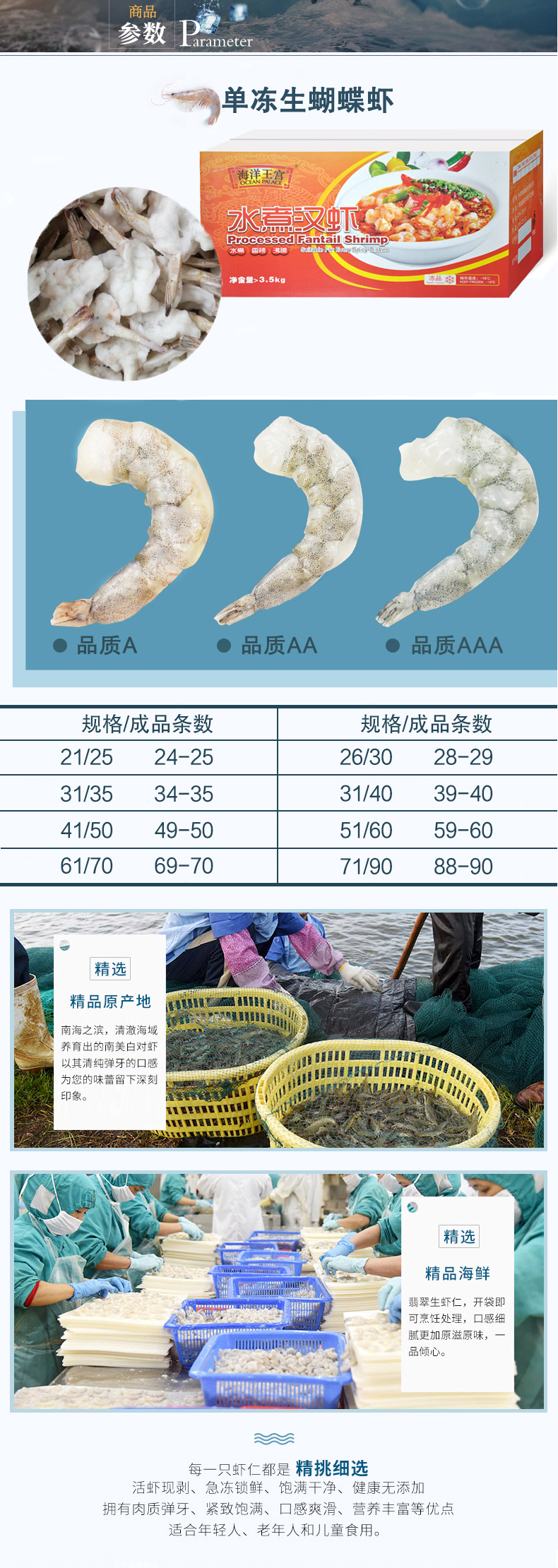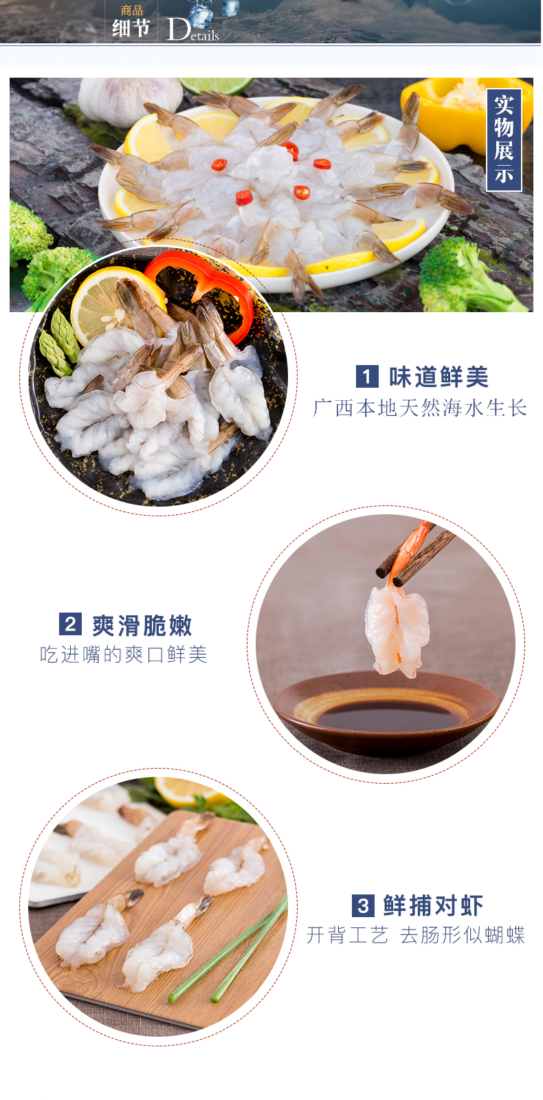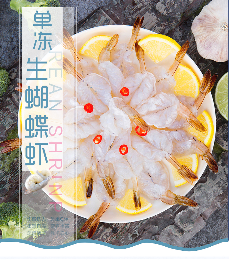 本產(chǎn)品選用北部灣海域捕撈的鮮活白對(duì)蝦為原料,運(yùn)用專業(yè)冷鏈物流運(yùn)輸設(shè)備,把白對(duì)蝦迅速地運(yùn)送到潔凈的生產(chǎn)車間內(nèi),專業(yè)處理去頭去殼,去除蝦線保留蝦尾,再沿蝦體中部將蝦肉剖開,切割過程中不損害蝦體天然肉質(zhì)纖維,最終使蝦肉整體呈蝴蝶狀。在高端流水生產(chǎn)線進(jìn)行生產(chǎn)加工下,蝴蝶蝦肉能在新鮮狀態(tài)下成為速凍產(chǎn)品,最大限度地保存了蝴蝶蝦肉的鮮美品質(zhì)。產(chǎn)品包裝美觀實(shí)用,分量充足,食用方便,蝦肉外形精致,口味鮮甜清新,可用于烹制黃金蝴蝶蝦、翡翠蝴蝶蝦等日常家庭菜肴或各式餐飲場(chǎng)合。