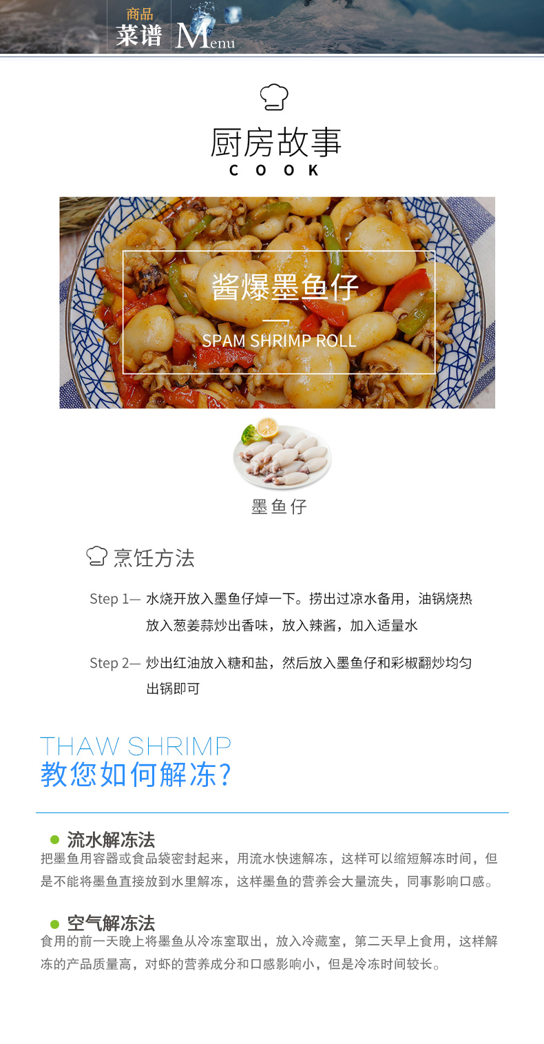 墨魚口感鮮脆爽口,肉汁豐富,具有較高的營養(yǎng)價值,是一種高蛋白低脂肪的滋補海產(chǎn)食品。本產(chǎn)品選用北部灣海域捕撈的鮮活墨魚為原料,運用專業(yè)冷鏈物流運輸設(shè)備,把墨魚迅速地運送到潔凈的生產(chǎn)車間內(nèi),由專人細(xì)心清洗,修剪并去除內(nèi)臟,并以完善的冷凍保鮮技術(shù)和嶄新的高端流水生產(chǎn)線進行生產(chǎn)加工,使墨魚能在新鮮狀態(tài)下加工成為速凍產(chǎn)品。加工后的墨魚條條圓潤飽滿、色澤鮮亮潔白,肉質(zhì)富有彈性,水靈欲滴,保留了鮮活墨魚的鮮美品質(zhì)。