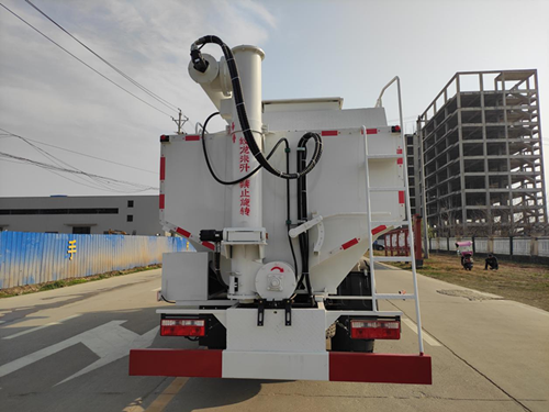 散裝飼料運(yùn)輸車(chē),散裝飼料車(chē)的飼料罐架設(shè)在卡車(chē)的底盤(pán)上,罐頂開(kāi)有進(jìn)料口.頂部的一根螺旋輸送卸料管(俗稱卸料絞龍)則可自由回轉(zhuǎn)和抬升,抬升的仰角可達(dá)60度。運(yùn)輸時(shí),頂部的螺旋管平臥在罐頂;卸料時(shí)則抬起,使管端的出料口與畜禽飼養(yǎng)場(chǎng)貯料罐頂部的進(jìn)料門(mén)相接,駕駛室內(nèi)裝有操縱裝置(操縱裝置也可裝置在罐體尾部),卸料時(shí)通過(guò)車(chē)底的動(dòng)力輸出軸和減速器來(lái)驅(qū)動(dòng)螺旋,以完成卸料。