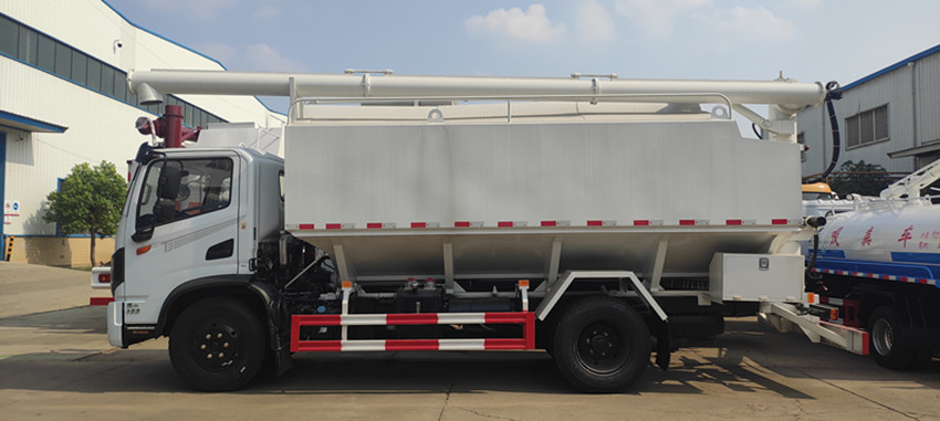 散裝飼料運輸車,散裝飼料車的飼料罐架設在卡車的底盤上,罐頂開有進料口.頂部的一根螺旋輸送卸料管(俗稱卸料絞龍)則可自由回轉和抬升,抬升的仰角可達60度。運輸時,頂部的螺旋管平臥在罐頂;卸料時則抬起,使管端的出料口與畜禽飼養(yǎng)場貯料罐頂部的進料門相接,駕駛室內(nèi)裝有操縱裝置(操縱裝置也可裝置在罐體尾部),卸料時通過車底的動力輸出軸和減速器來驅(qū)動螺旋,以完成卸料。