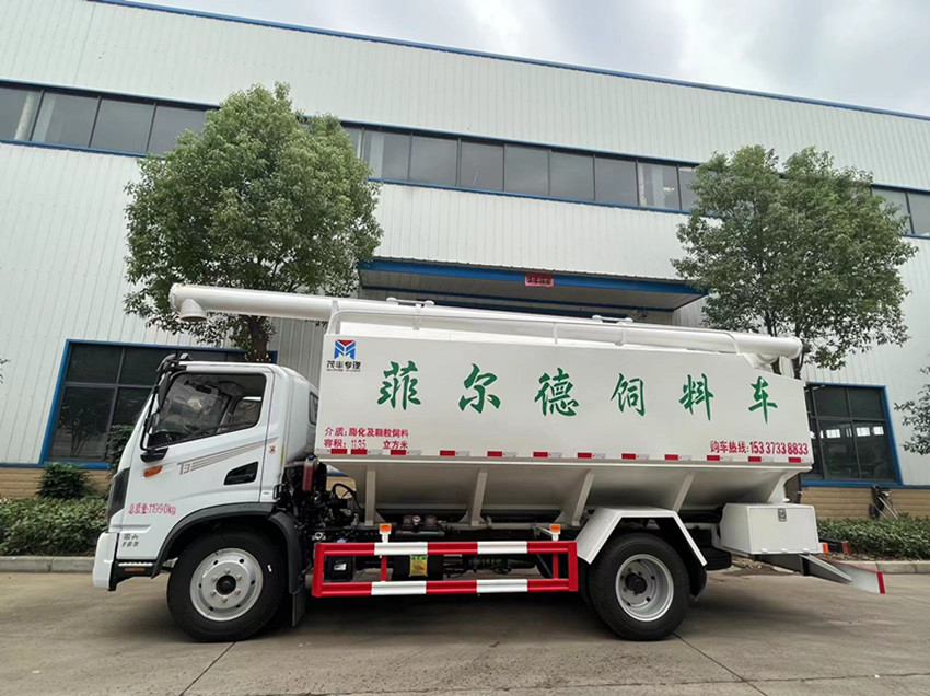 散裝飼料運(yùn)輸車,散裝飼料車的飼料罐架設(shè)在卡車的底盤上,罐頂開有進(jìn)料口.頂部的一根螺旋輸送卸料管(俗稱卸料絞龍)則可自由回轉(zhuǎn)和抬升,抬升的仰角可達(dá)60度。運(yùn)輸時,頂部的螺旋管平臥在罐頂;卸料時則抬起,使管端的出料口與畜禽飼養(yǎng)場貯料罐頂部的進(jìn)料門相接,駕駛室內(nèi)裝有操縱裝置(操縱裝置也可裝置在罐體尾部),卸料時通過車底的動力輸出軸和減速器來驅(qū)動螺旋,以完成卸料。