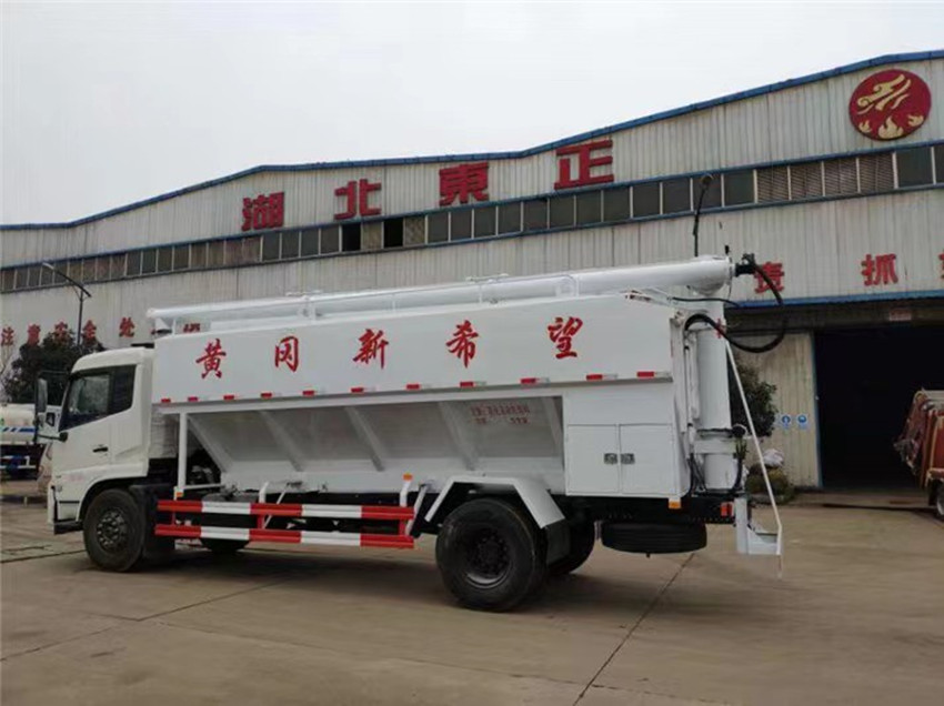 散裝飼料運輸車,散裝飼料車的飼料罐架設在卡車的底盤上,罐頂開有進料口.頂部的一根螺旋輸送卸料管(俗稱卸料絞龍)則可自由回轉和抬升,抬升的仰角可達60度。運輸時,頂部的螺旋管平臥在罐頂;卸料時則抬起,使管端的出料口與畜禽飼養(yǎng)場貯料罐頂部的進料門相接,駕駛室內裝有操縱裝置(操縱裝置也可裝置在罐體尾部),卸料時通過車底的動力輸出軸和減速器來驅動螺旋,以完成卸料。