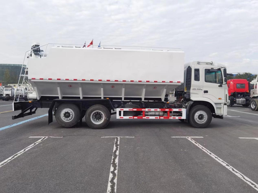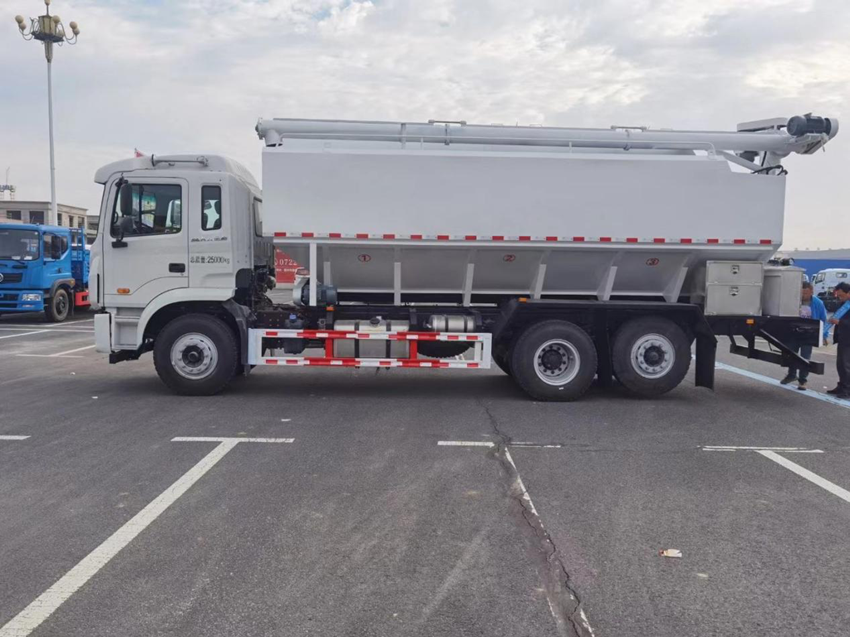 散裝飼料運(yùn)輸車,散裝飼料車的飼料罐架設(shè)在卡車的底盤上,罐頂開有進(jìn)料口.頂部的一根螺旋輸送卸料管(俗稱卸料絞龍)則可自由回轉(zhuǎn)和抬升,抬升的仰角可達(dá)60度。運(yùn)輸時(shí),頂部的螺旋管平臥在罐頂;卸料時(shí)則抬起,使管端的出料口與畜禽飼養(yǎng)場貯料罐頂部的進(jìn)料門相接,駕駛室內(nèi)裝有操縱裝置(操縱裝置也可裝置在罐體尾部),卸料時(shí)通過車底的動力輸出軸和減速器來驅(qū)動螺旋,以完成卸料。