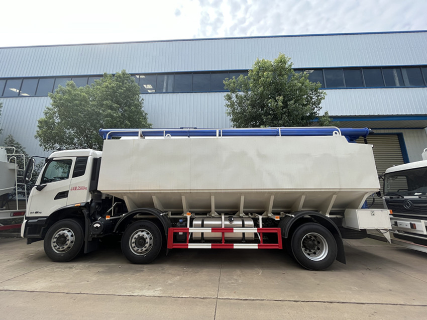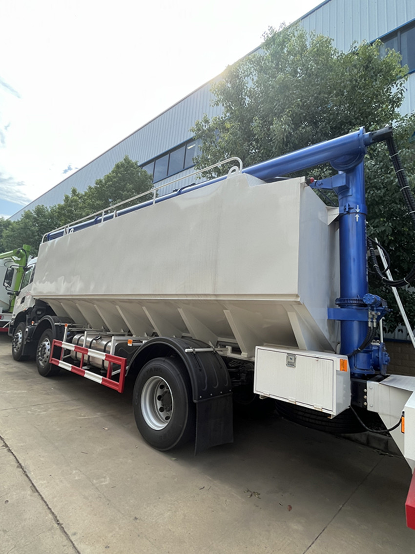 散裝飼料運(yùn)輸車,散裝飼料車的飼料罐架設(shè)在卡車的底盤上,罐頂開有進(jìn)料口.頂部的一根螺旋輸送卸料管(俗稱卸料絞龍)則可自由回轉(zhuǎn)和抬升,抬升的仰角可達(dá)60度。運(yùn)輸時(shí),頂部的螺旋管平臥在罐頂;卸料時(shí)則抬起,使管端的出料口與畜禽飼養(yǎng)場(chǎng)貯料罐頂部的進(jìn)料門相接,駕駛室內(nèi)裝有操縱裝置(操縱裝置也可裝置在罐體尾部),卸料時(shí)通過(guò)車底的動(dòng)力輸出軸和減速器來(lái)驅(qū)動(dòng)螺旋,以完成卸料。