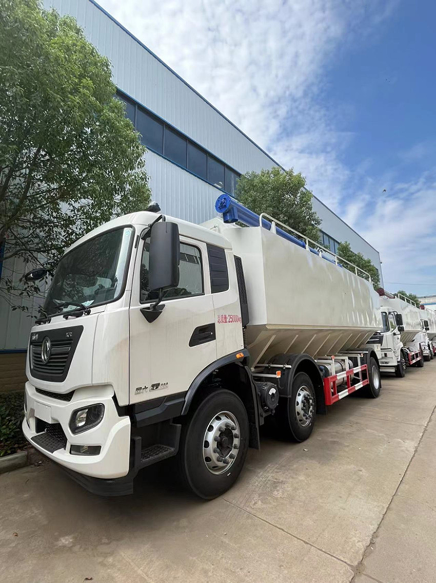 散裝飼料運輸車,散裝飼料車的飼料罐架設(shè)在卡車的底盤上,罐頂開有進(jìn)料口.頂部的一根螺旋輸送卸料管(俗稱卸料絞龍)則可自由回轉(zhuǎn)和抬升,抬升的仰角可達(dá)60度。運輸時,頂部的螺旋管平臥在罐頂;卸料時則抬起,使管端的出料口與畜禽飼養(yǎng)場貯料罐頂部的進(jìn)料門相接,駕駛室內(nèi)裝有操縱裝置(操縱裝置也可裝置在罐體尾部),卸料時通過車底的動力輸出軸和減速器來驅(qū)動螺旋,以完成卸料。