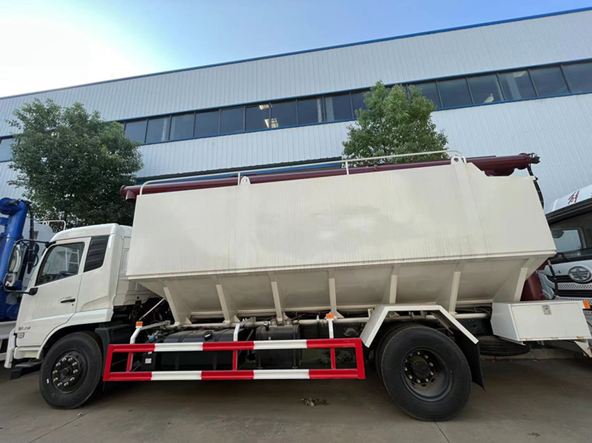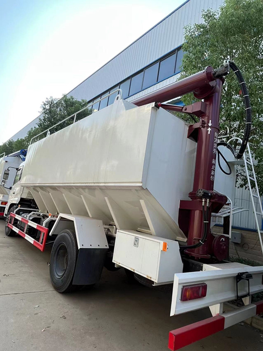 散裝飼料運(yùn)輸車(chē),散裝飼料車(chē)的飼料罐架設(shè)在卡車(chē)的底盤(pán)上,罐頂開(kāi)有進(jìn)料口.頂部的一根螺旋輸送卸料管(俗稱(chēng)卸料絞龍)則可自由回轉(zhuǎn)和抬升,抬升的仰角可達(dá)60度。運(yùn)輸時(shí),頂部的螺旋管平臥在罐頂;卸料時(shí)則抬起,使管端的出料口與畜禽飼養(yǎng)場(chǎng)貯料罐頂部的進(jìn)料門(mén)相接,駕駛室內(nèi)裝有操縱裝置(操縱裝置也可裝置在罐體尾部),卸料時(shí)通過(guò)車(chē)底的動(dòng)力輸出軸和減速器來(lái)驅(qū)動(dòng)螺旋,以完成卸料。