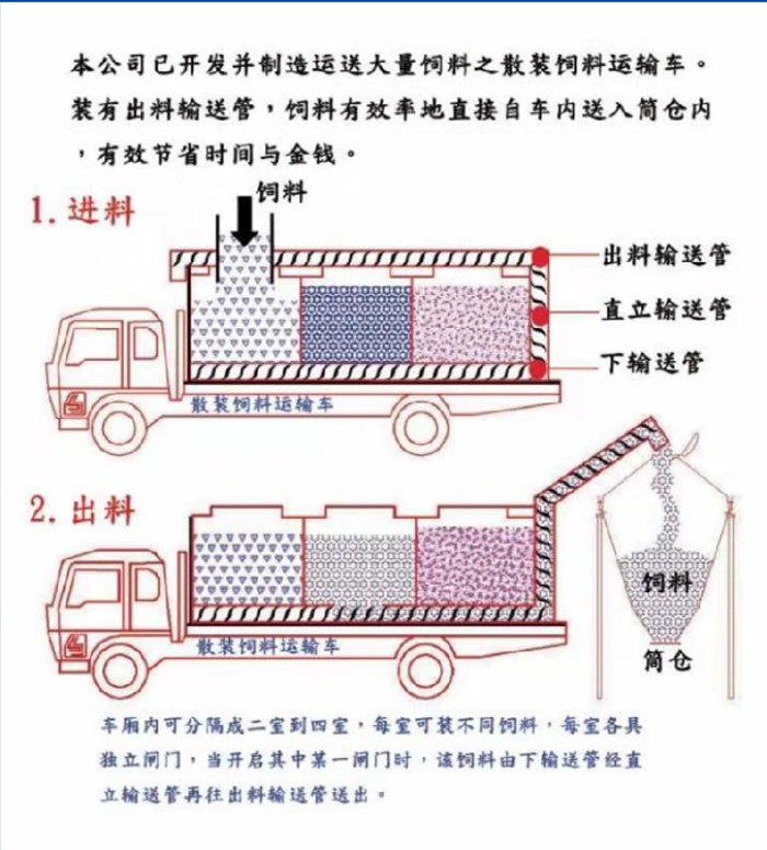 上裝配置:罐體采用4mm優(yōu)質(zhì)鈦鋼板制作,罐體分為肆個(gè)倉(可根據(jù)用戶需求做多個(gè)分倉),可以各分倉卸料順序和速度,整車3條絞龍(底部水平絞龍、尾部垂直絞龍、頂部舉升絞龍),由3個(gè)5.5kw 380v電機(jī)帶動(dòng)各絞龍工作,頂部絞龍液壓舉升,可左右旋轉(zhuǎn)180°