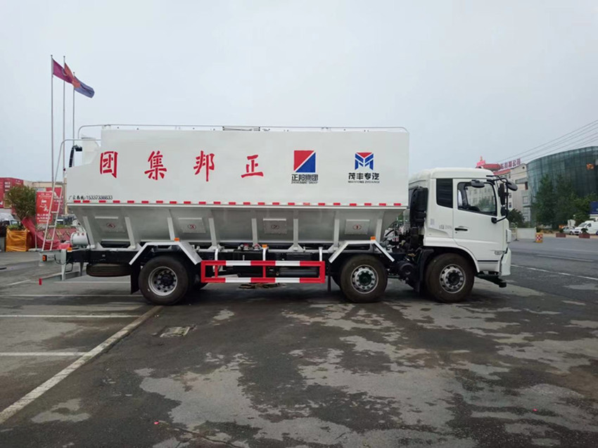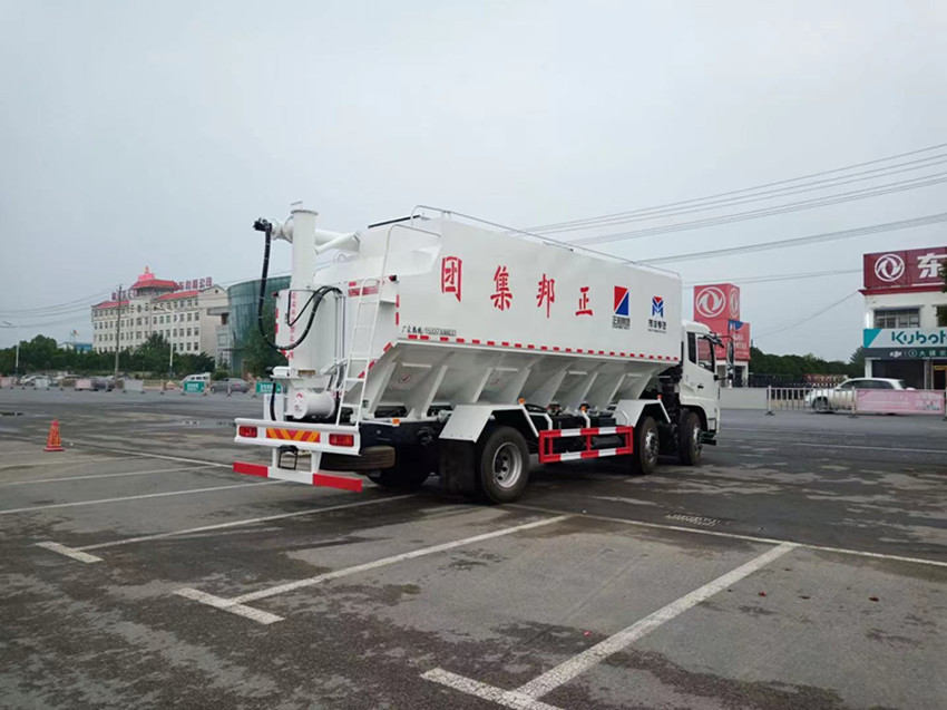 散裝飼料運(yùn)輸車(chē),散裝飼料車(chē)的飼料罐架設(shè)在卡車(chē)的底盤(pán)上,罐頂開(kāi)有進(jìn)料口.頂部的一根螺旋輸送卸料管(俗稱卸料絞龍)則可自由回轉(zhuǎn)和抬升,抬升的仰角可達(dá)60度。運(yùn)輸時(shí),頂部的螺旋管平臥在罐頂;卸料時(shí)則抬起,使管端的出料口與畜禽飼養(yǎng)場(chǎng)貯料罐頂部的進(jìn)料門(mén)相接,駕駛室內(nèi)裝有操縱裝置(操縱裝置也可裝置在罐體尾部),卸料時(shí)通過(guò)車(chē)底的動(dòng)力輸出軸和減速器來(lái)驅(qū)動(dòng)螺旋,以完成卸料。