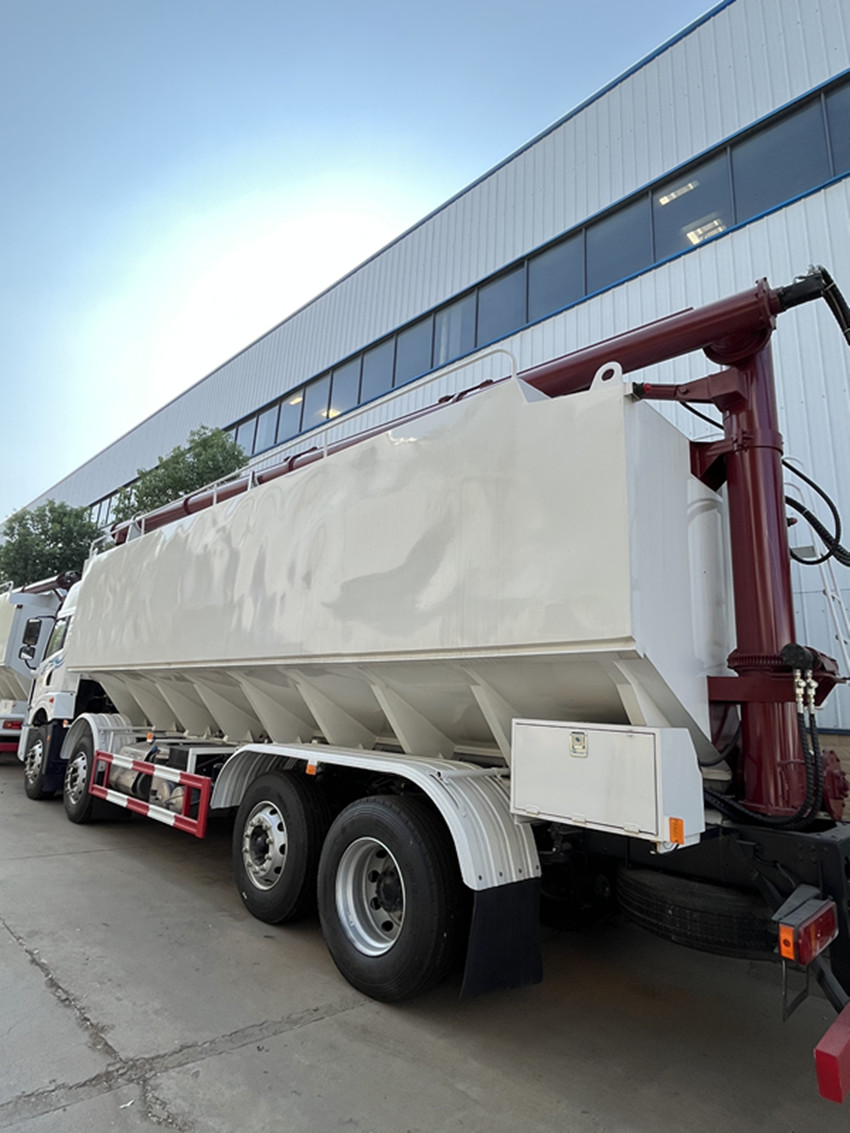 散裝飼料運(yùn)輸車,散裝飼料車的飼料罐架設(shè)在卡車的底盤上,罐頂開有進(jìn)料口.頂部的一根螺旋輸送卸料管(俗稱卸料絞龍)則可自由回轉(zhuǎn)和抬升,抬升的仰角可達(dá)60度。運(yùn)輸時(shí),頂部的螺旋管平臥在罐頂;卸料時(shí)則抬起,使管端的出料口與畜禽飼養(yǎng)場(chǎng)貯料罐頂部的進(jìn)料門相接,駕駛室內(nèi)裝有操縱裝置(操縱裝置也可裝置在罐體尾部),卸料時(shí)通過車底的動(dòng)力輸出軸和減速器來驅(qū)動(dòng)螺旋,以完成卸料。