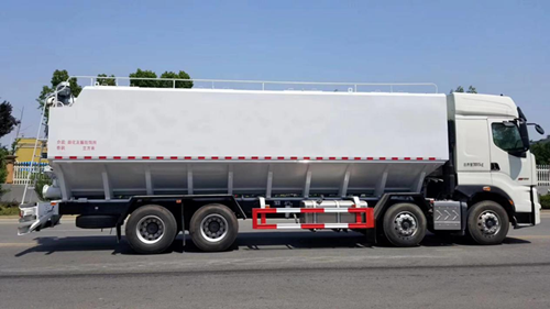 散裝飼料運(yùn)輸車,散裝飼料車的飼料罐架設(shè)在卡車的底盤上,罐頂開有進(jìn)料口.頂部的一根螺旋輸送卸料管(俗稱卸料絞龍)則可自由回轉(zhuǎn)和抬升,抬升的仰角可達(dá)60度。運(yùn)輸時,頂部的螺旋管平臥在罐頂;卸料時則抬起,使管端的出料口與畜禽飼養(yǎng)場貯料罐頂部的進(jìn)料門相接,駕駛室內(nèi)裝有操縱裝置(操縱裝置也可裝置在罐體尾部),卸料時通過車底的動力輸出軸和減速器來驅(qū)動螺旋,以完成卸料。